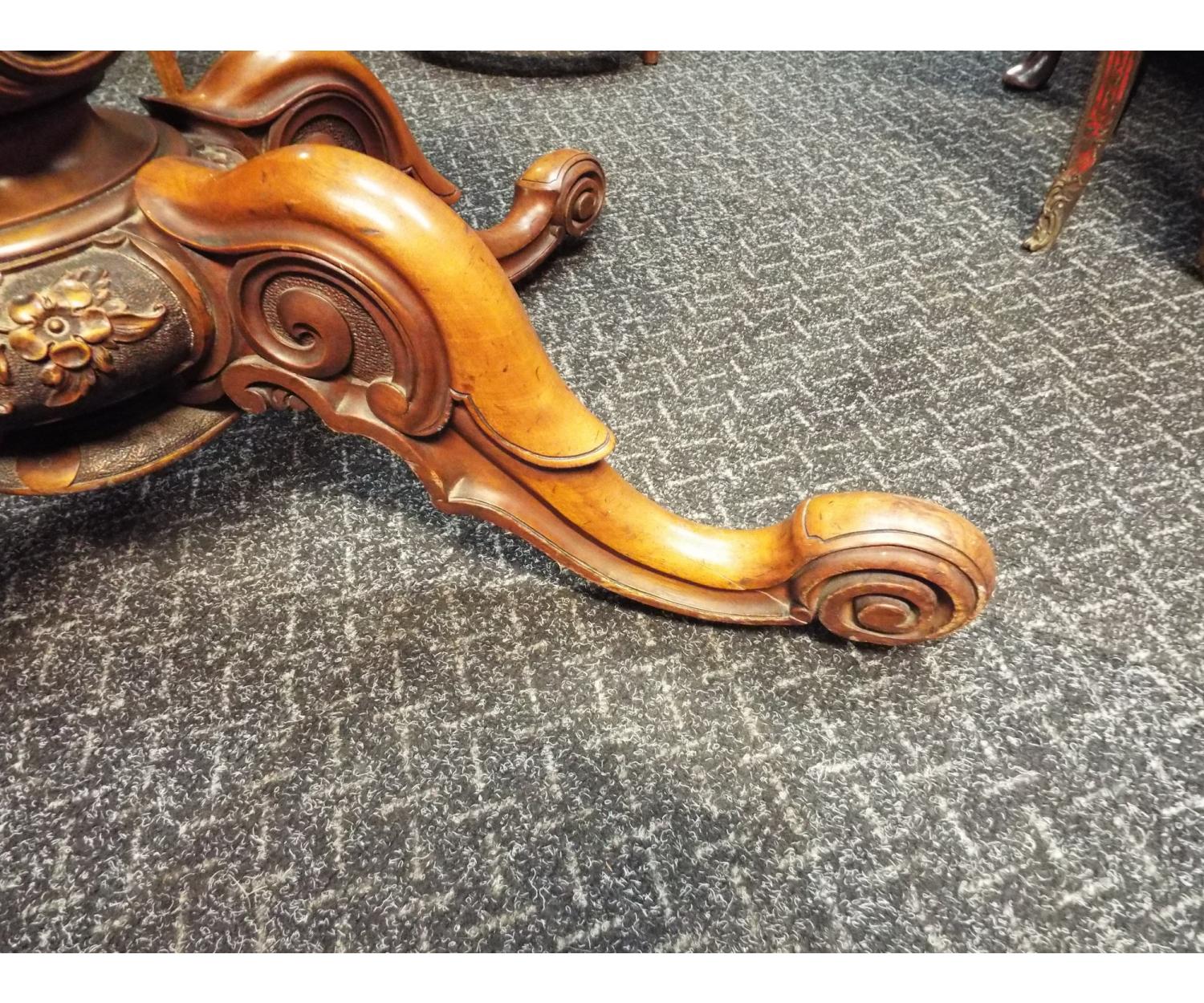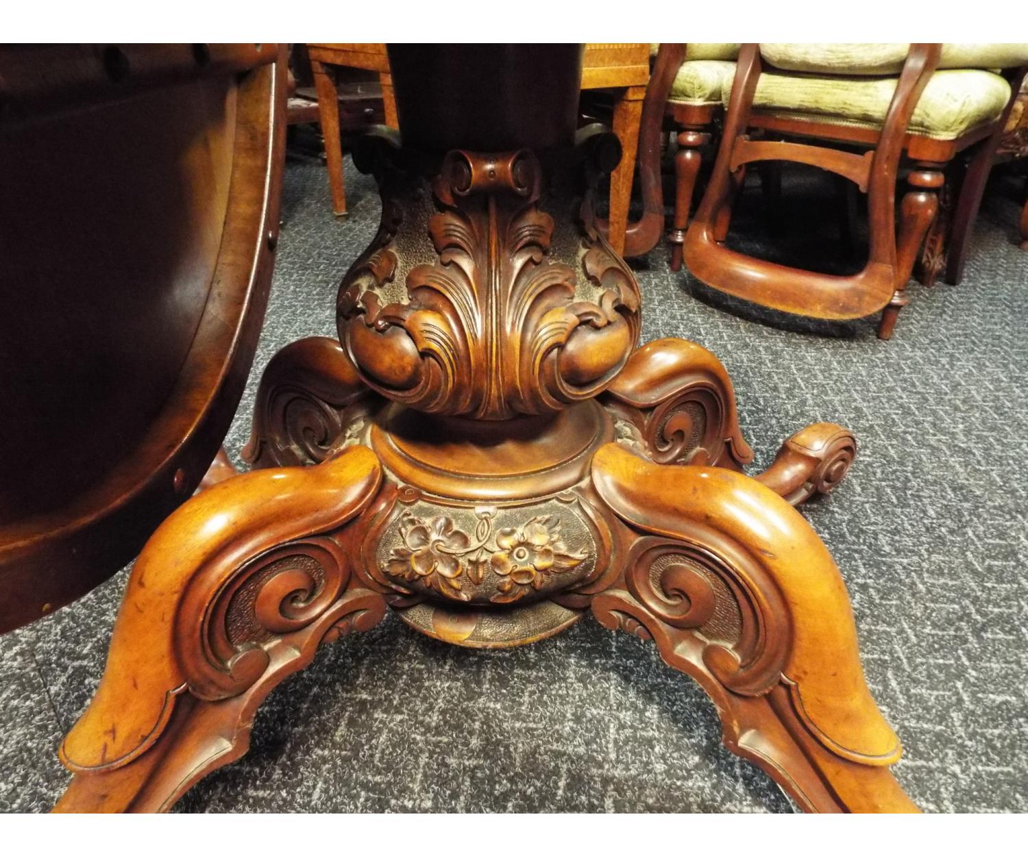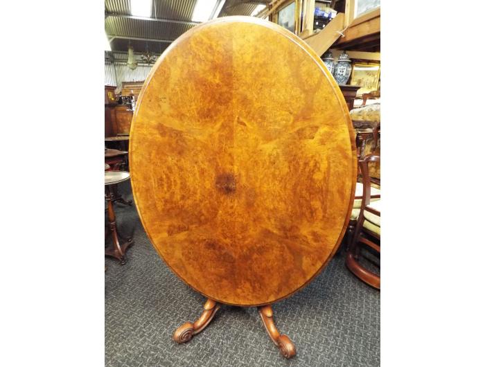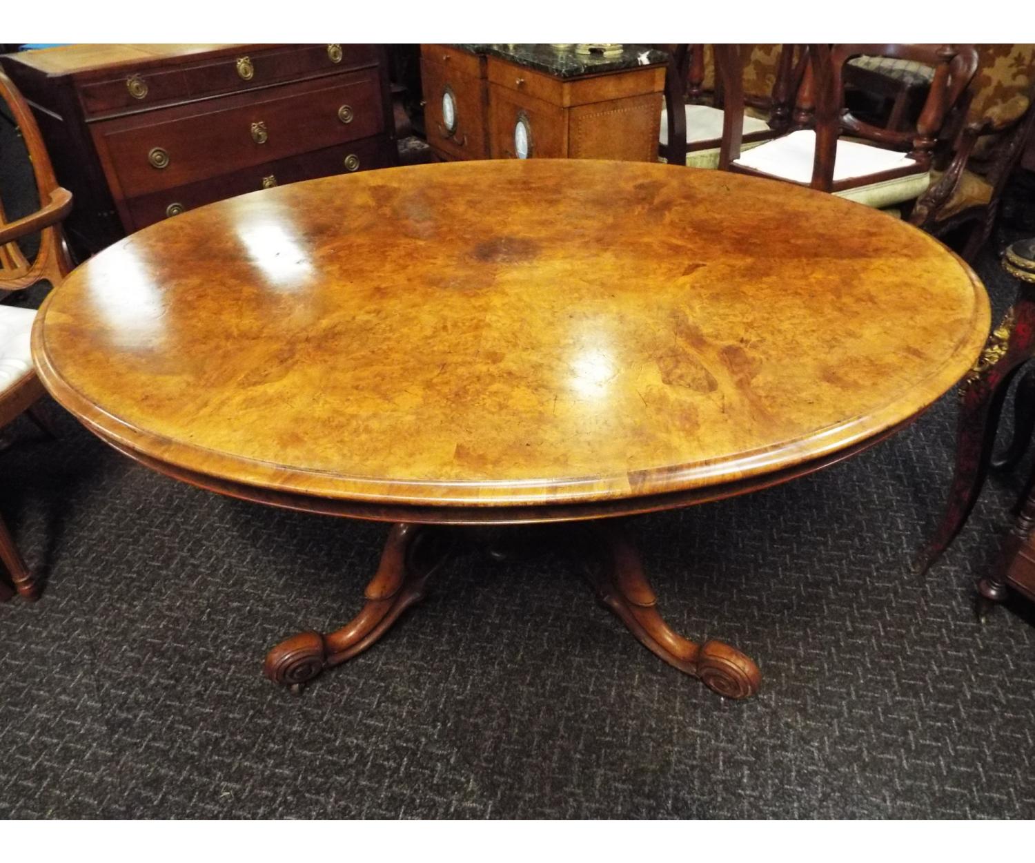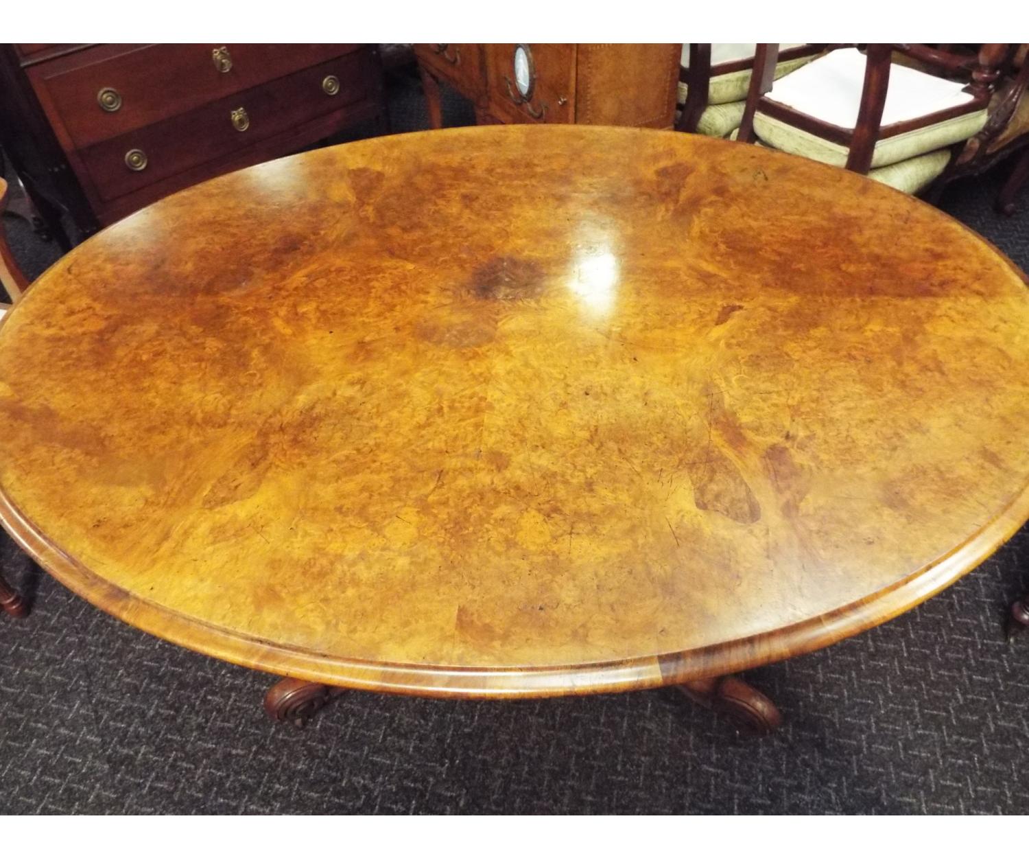 Walnut oval Looe Table. Top has quartered vaneers, base has carved central column and four splayed legs. Circa 1860